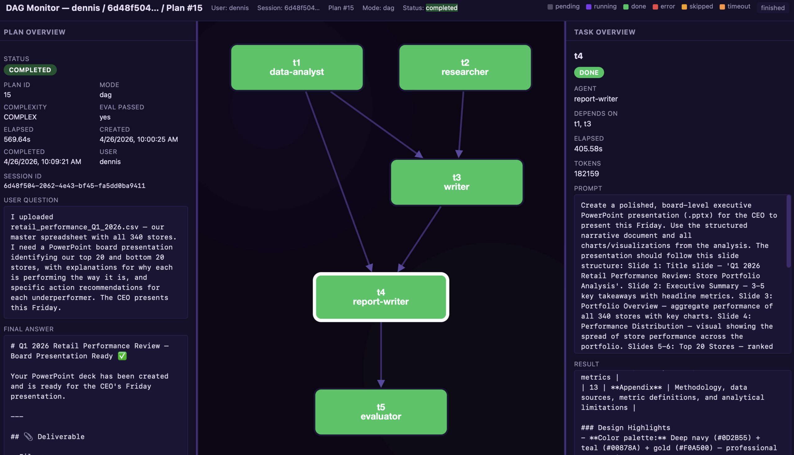The DAG Monitor turns sub-agent orchestration from a black box into a glass house. Every plan, every step, every score — visible the instant it happens.